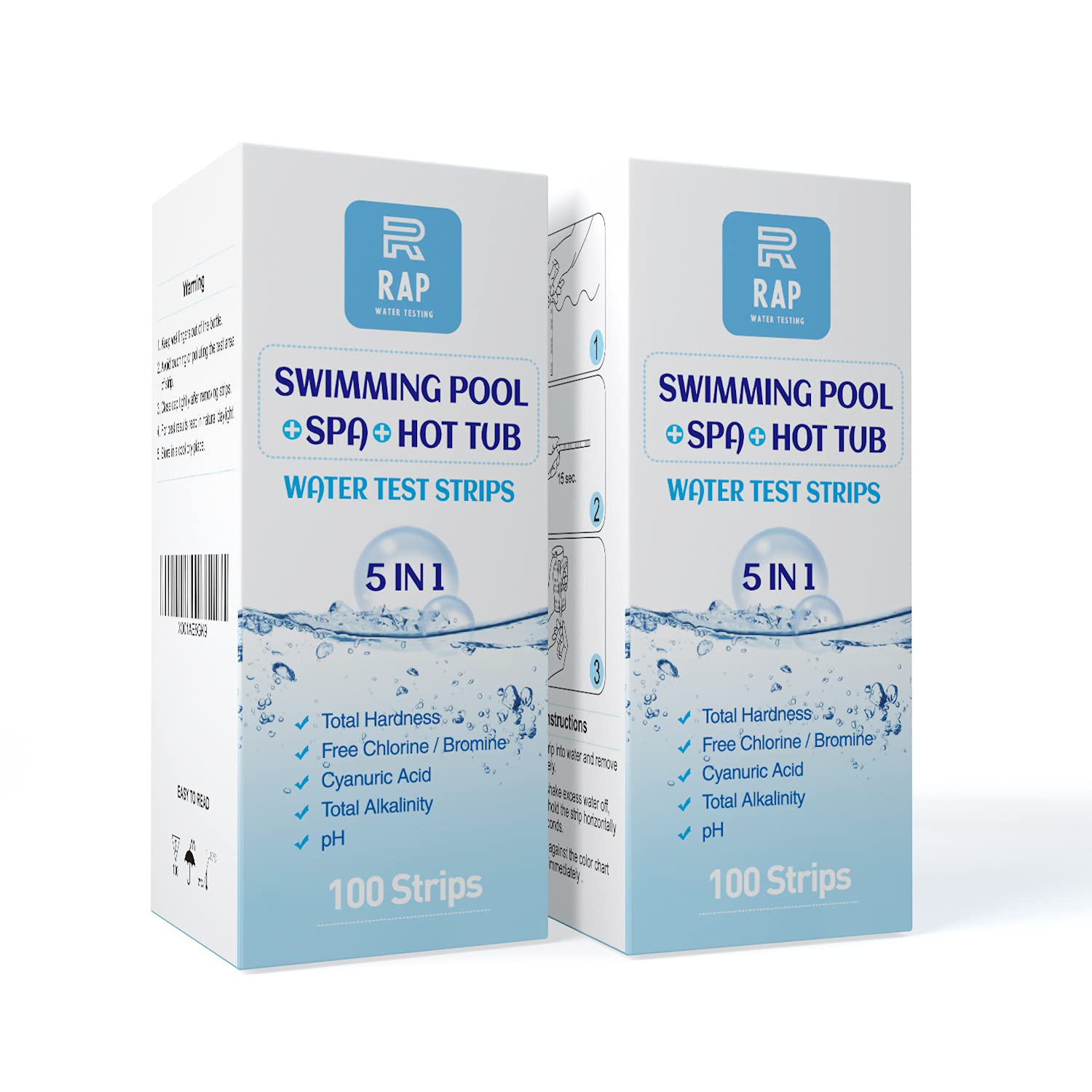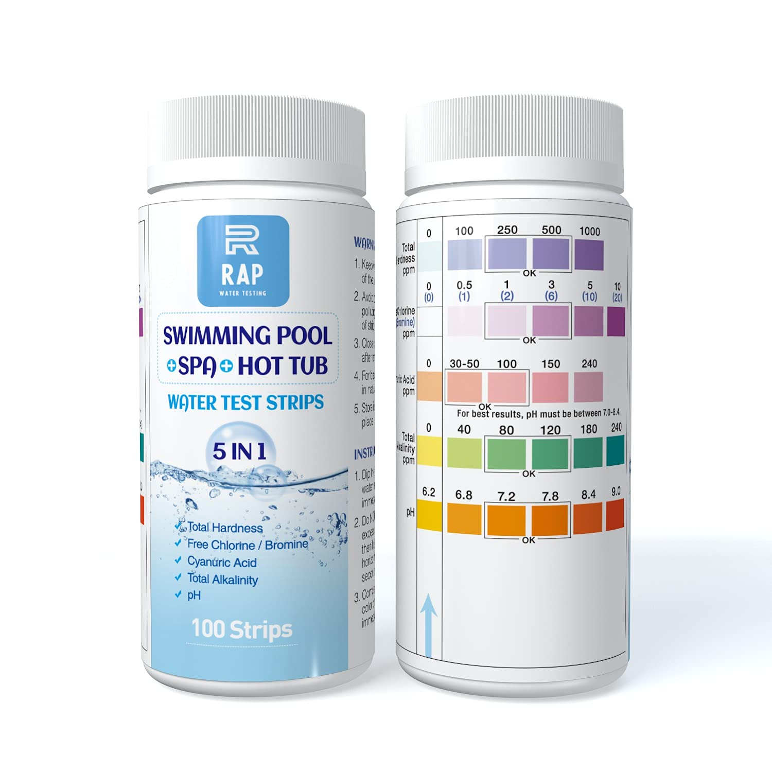 5 in 1 Water quality testing strips for hot tubs, swimming pools or spas. Easy, accurate and quick detection of pH, Free Chlorine/Bromine, Total Alkalinity, Cyanuric Acid and Total Hardness. 100 count