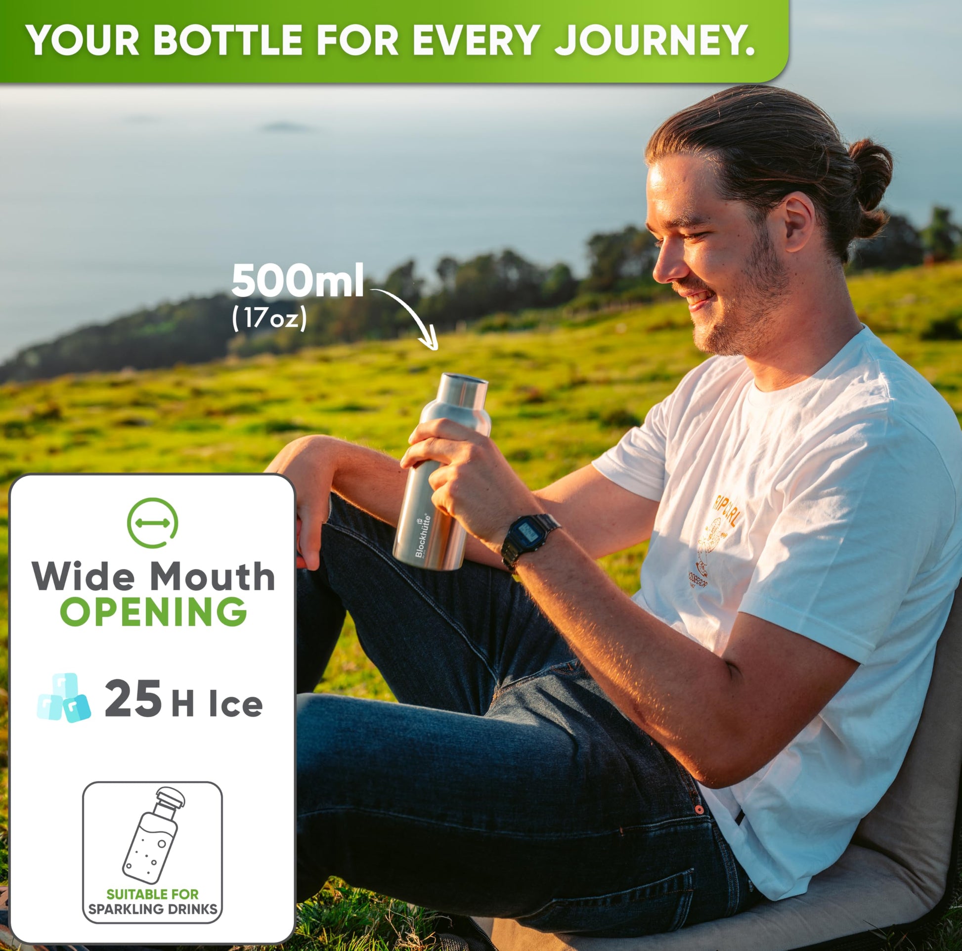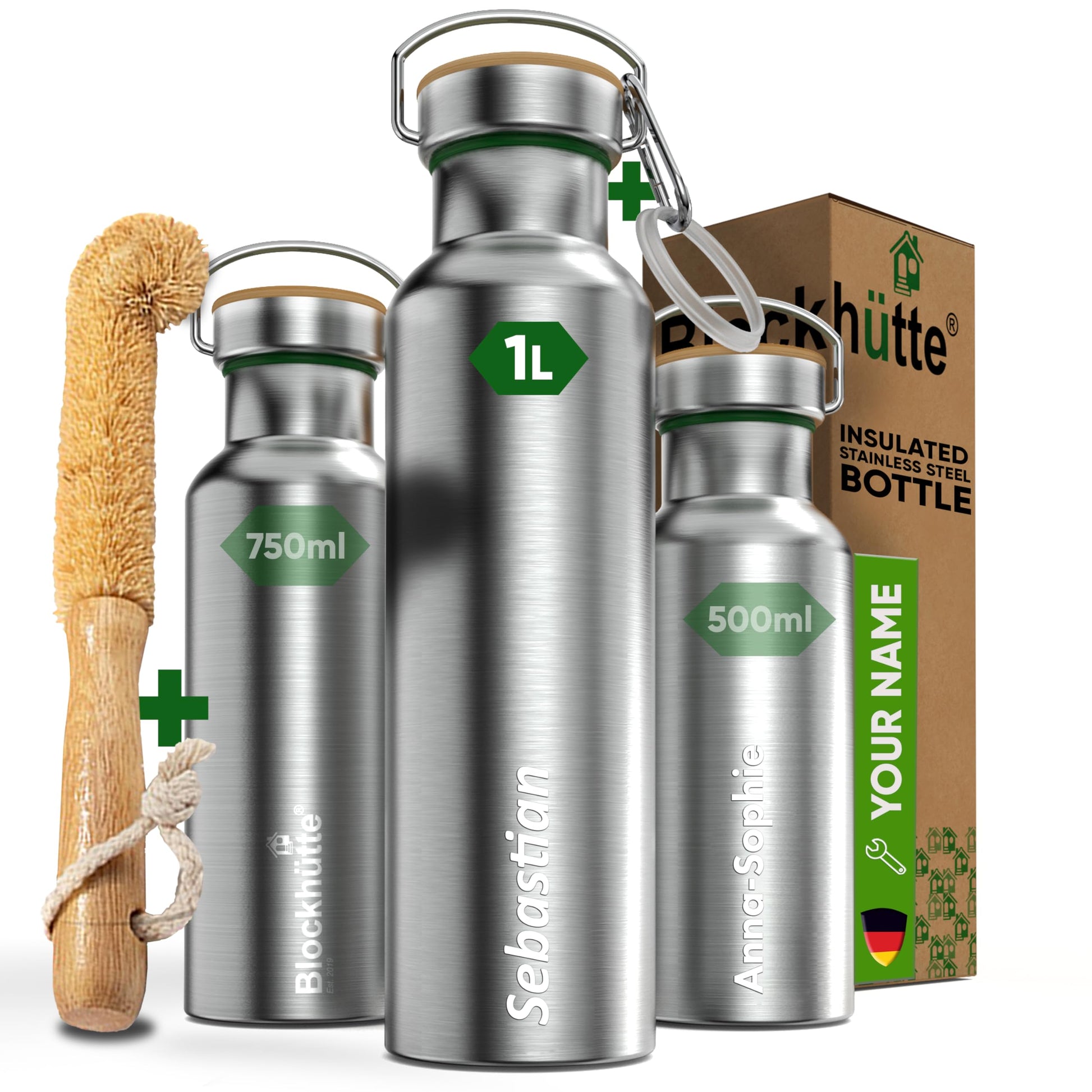 Blockhütte Stainless Steel Water Bottle I 750ml I Insulated Metal Flask, BPA Free, Leakproof, Dishwasher Safe, Ideal for Gym, Travel, Cold Drinks, Reusable, with Natural Cleaning Brush