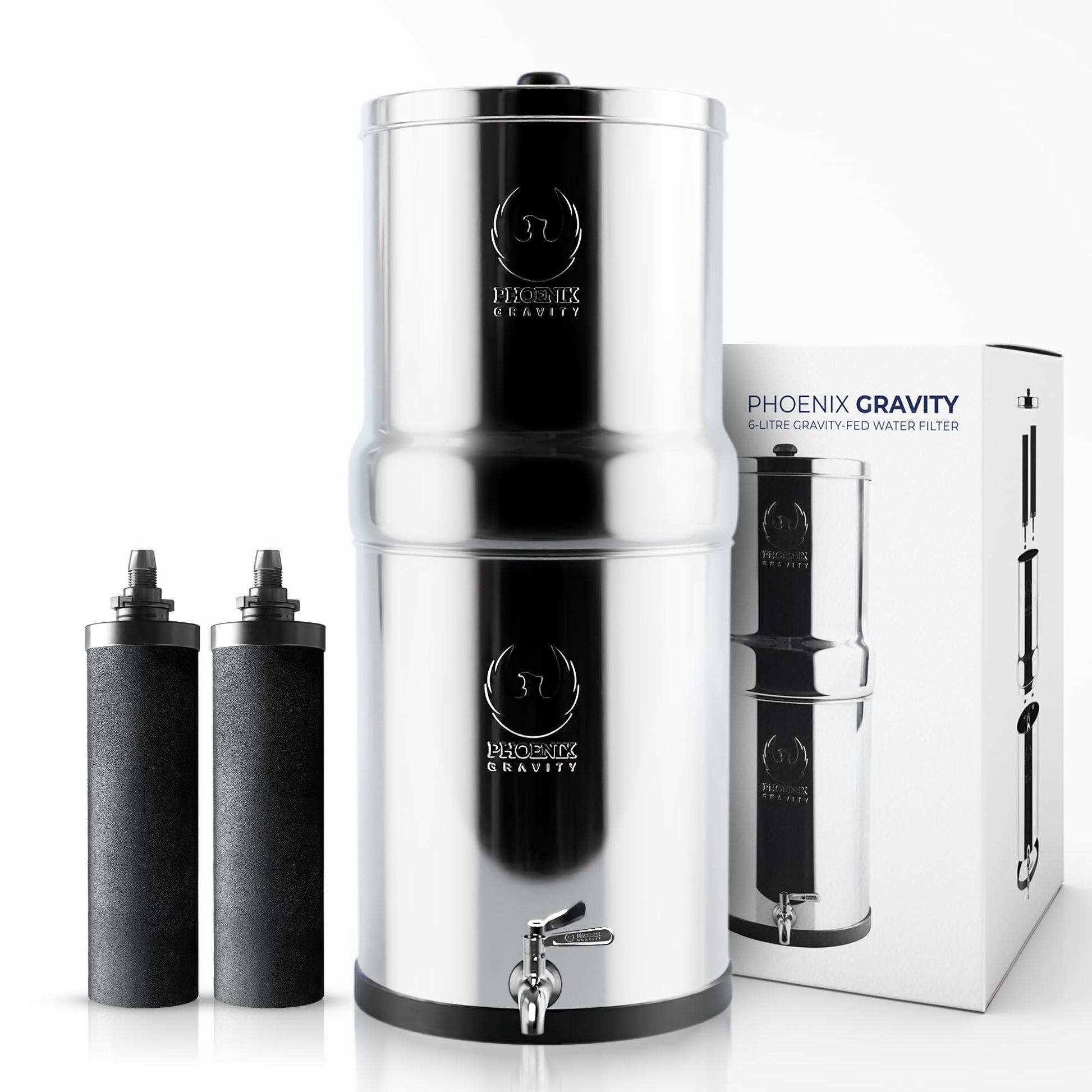 PHOENIX GRAVITY 6-Litre NSF Certified AISI 304 Stainless Steel Countertop Water Filter System with 2 Smart (Black) Carbon Filter Elements & Free Stainless Steel Water Tap (6 L)