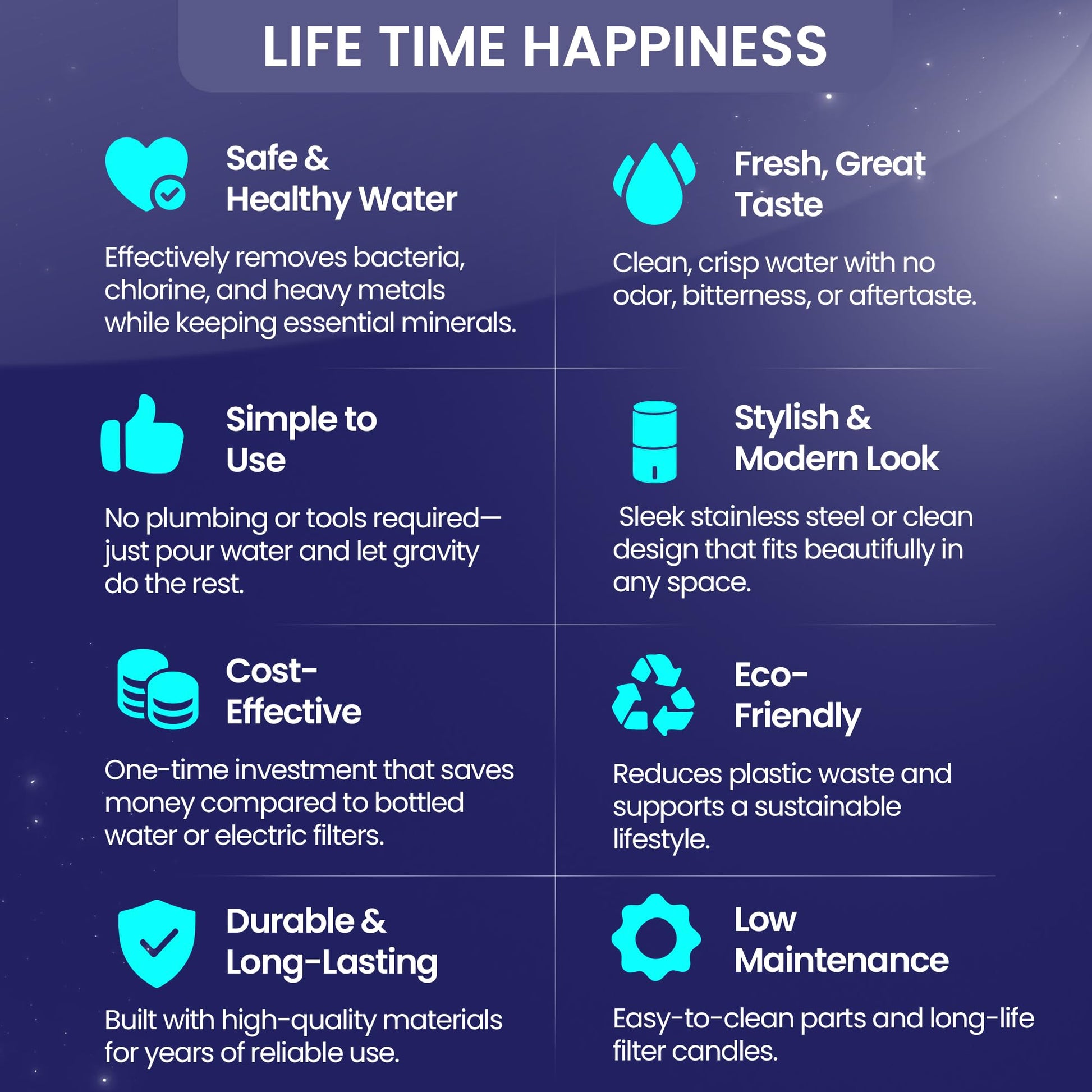 - Proven NSF-Certified Filtration Technology - Phoenix Gravity Water Filters are NSF-certified, independently tested to ensure over 99.99% reduction of contaminants such as bacteria, viruses, chlorine, heavy metals, microplastics, PFAS, and much more. Specially designed to retain essential minerals, it provides you with pure, safe drinking water.