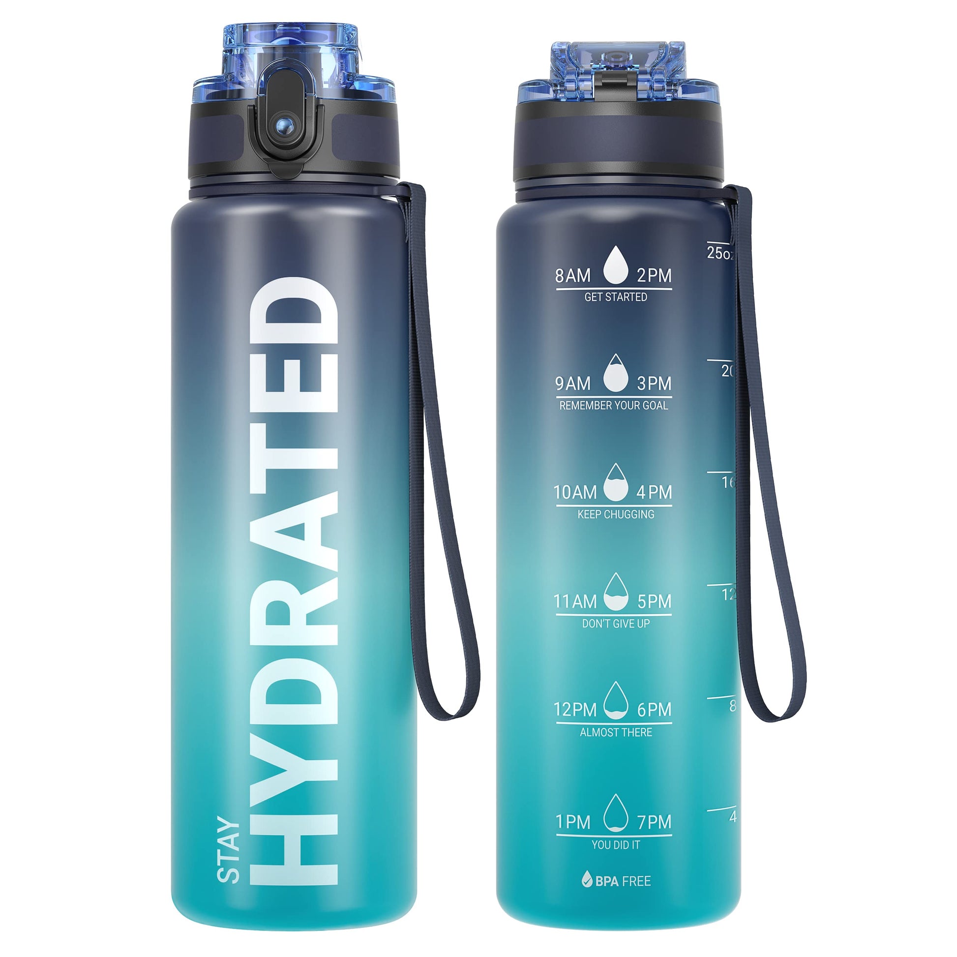 - WATER BOTTLE WITH TIME MARKINGS: Hydration is a simple trick that helps you stay healthy. This sport water bottle with motivational quotes and timestamps will always remind you to consume the right amount of water to stay hydrated throughout the day.